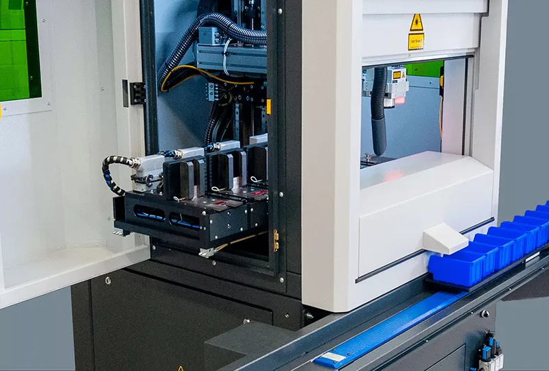 Optical part recognition from ACSYS is the key to highly efficient batch processing. The system is ideal if you feed several workpieces of the same type to your ACSYS system in bulk at the same time in order to process them in a single pass. How it works: The OPR camera module captures the parts on the workpiece carrier. The associated software uses the images to recognize the position and alignment of each individual workpiece and controls the laser so that the engravings or markings are always made exactly at the predefined position.