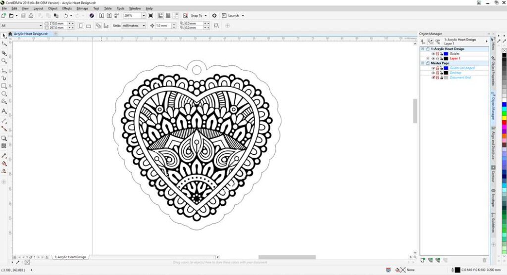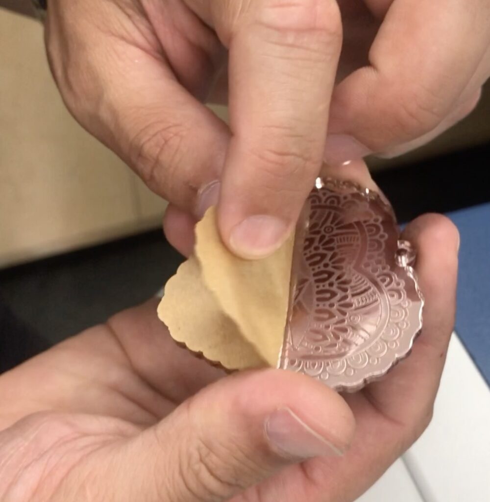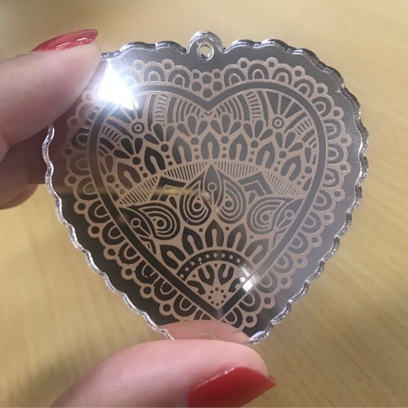 Set up your material masked facing down into the laser bed. We will be cutting out the heart mandala shape, and also engraving the pattern lines into the acrylic.