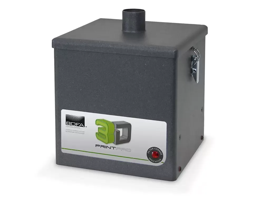 For open-framed 3D printers. The BOFA 3D PrintPRO 2 is a low-cost unit, that helps to filter fumes generated by an open-framed 3D printer without causing the filament deposition area to be cooled. It has the benefits of low noise levels and minimal power consumption. Each unit is supplied with a connection hose, ‘stay put’ arm and conical-shaped funnel.