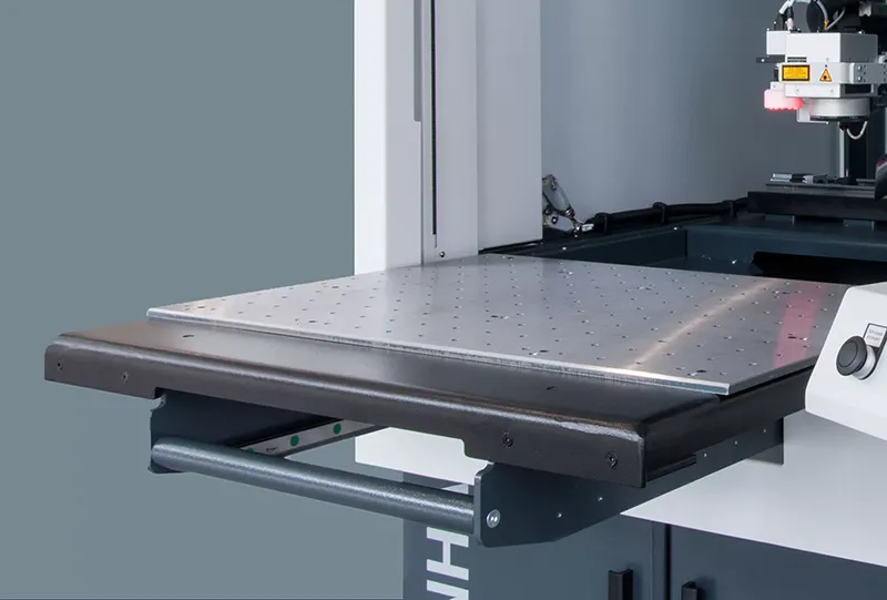 Particularly heavy components can be placed in the laser system with the aid of a heavy-duty drawer or a heavy-duty drawer pull-out. The advantages of the in-house development lie in the high payload combined with particularly easy accessibility. The load capacity of the pull-out varies depending on the machine type and equipment.